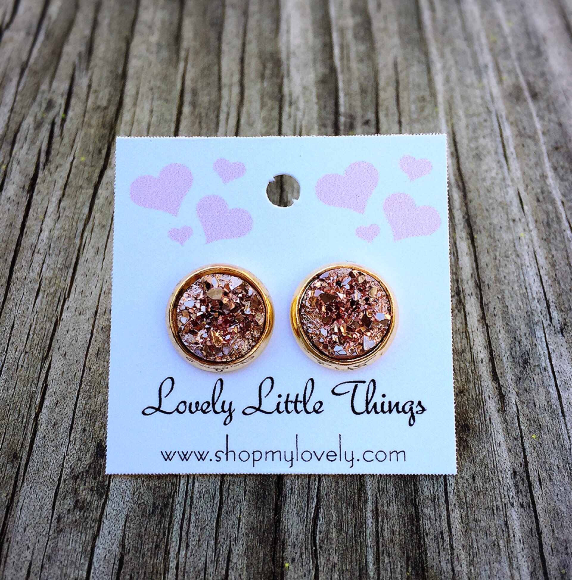 10mm rose gold faux druzy studs in a gold setting. These studs are SOOO sparkly!!! Perfect with any outfit! Dressed up or dressed down, they go with everything!