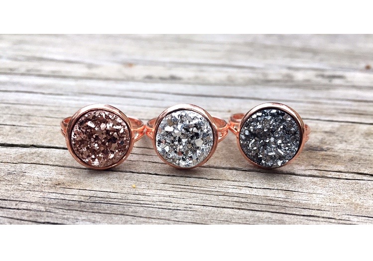12mm faux druzy ring in rose gold/copper setting. Ring is adjustable to any finger.