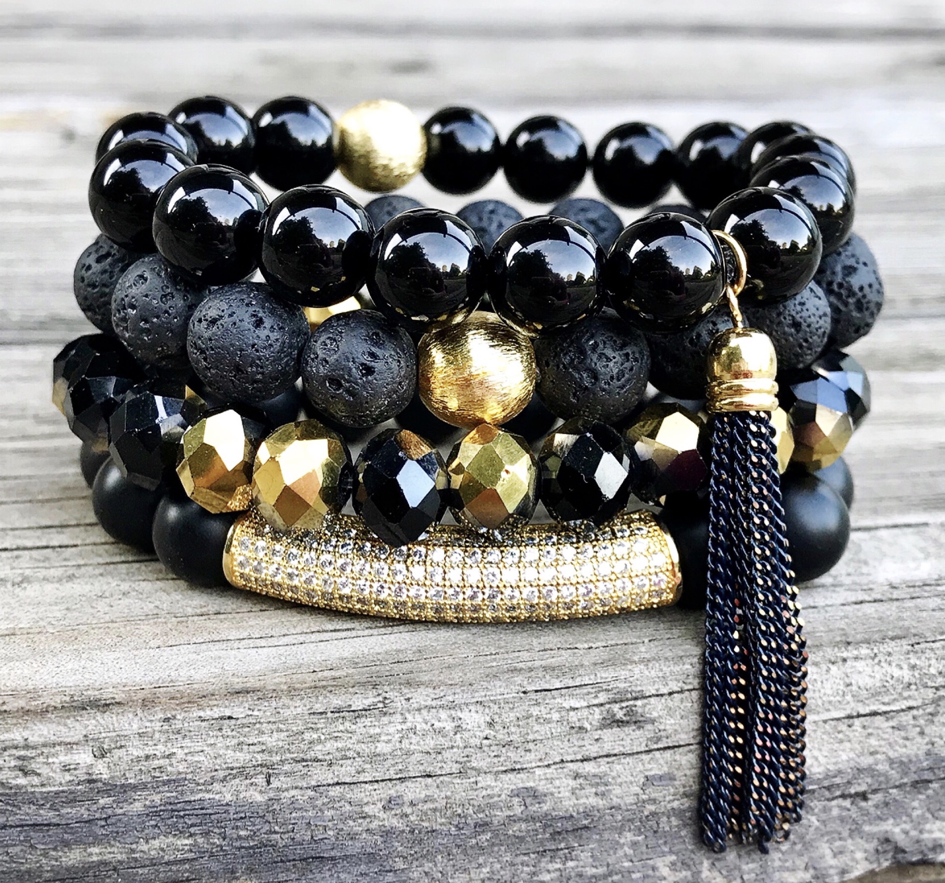 This stack includes 4 single bracelets with black & gold tassel & gold pave detail. Made with lava rock, crystal, & onyx.