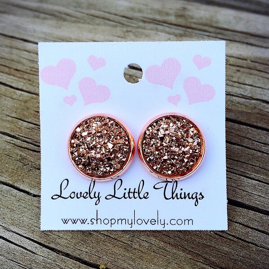 12mm thin cut rose gold druzy studs in a dark rose gold setting.