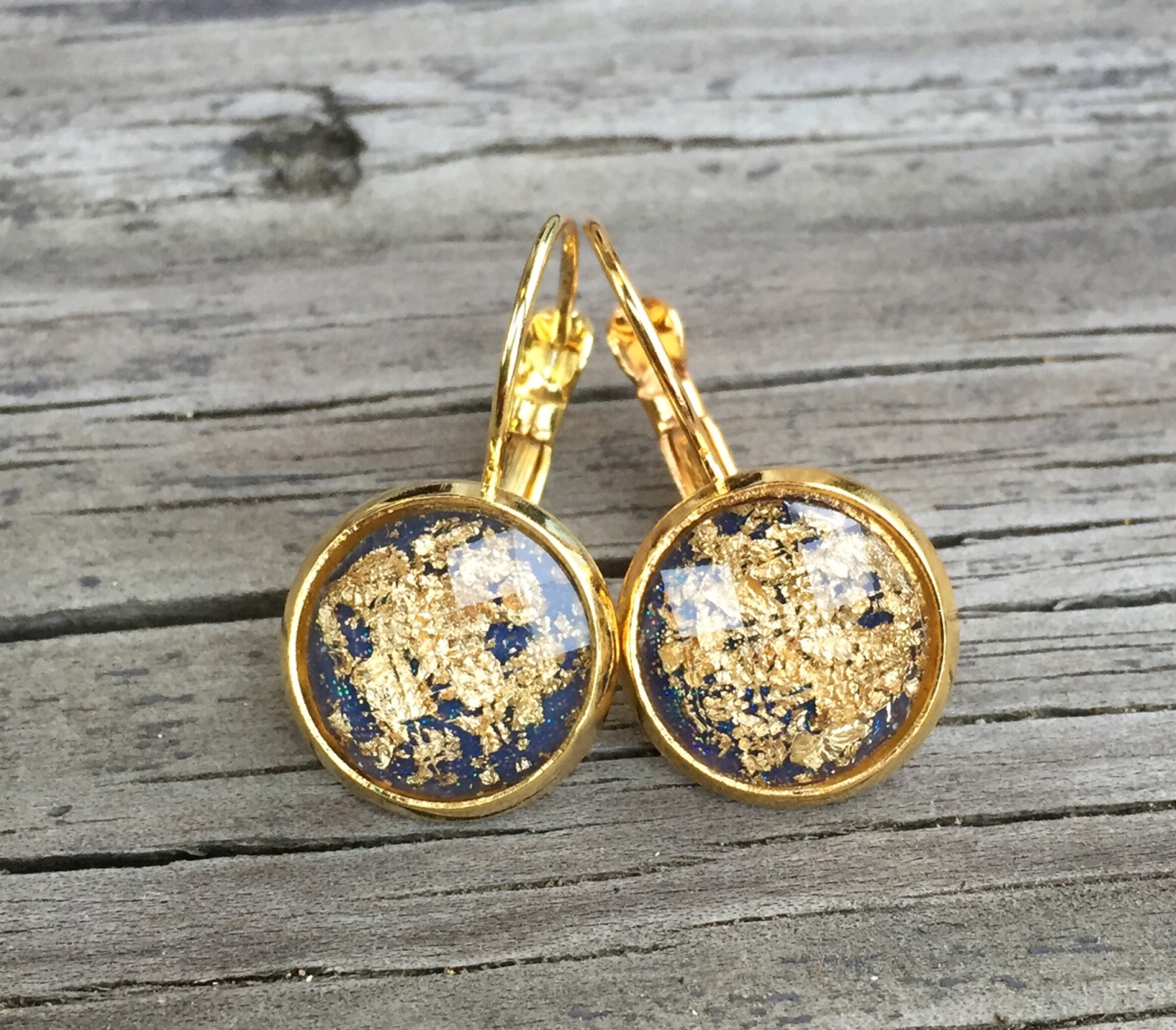 12mm pale blue & gold foil drop earrings in a gold setting.