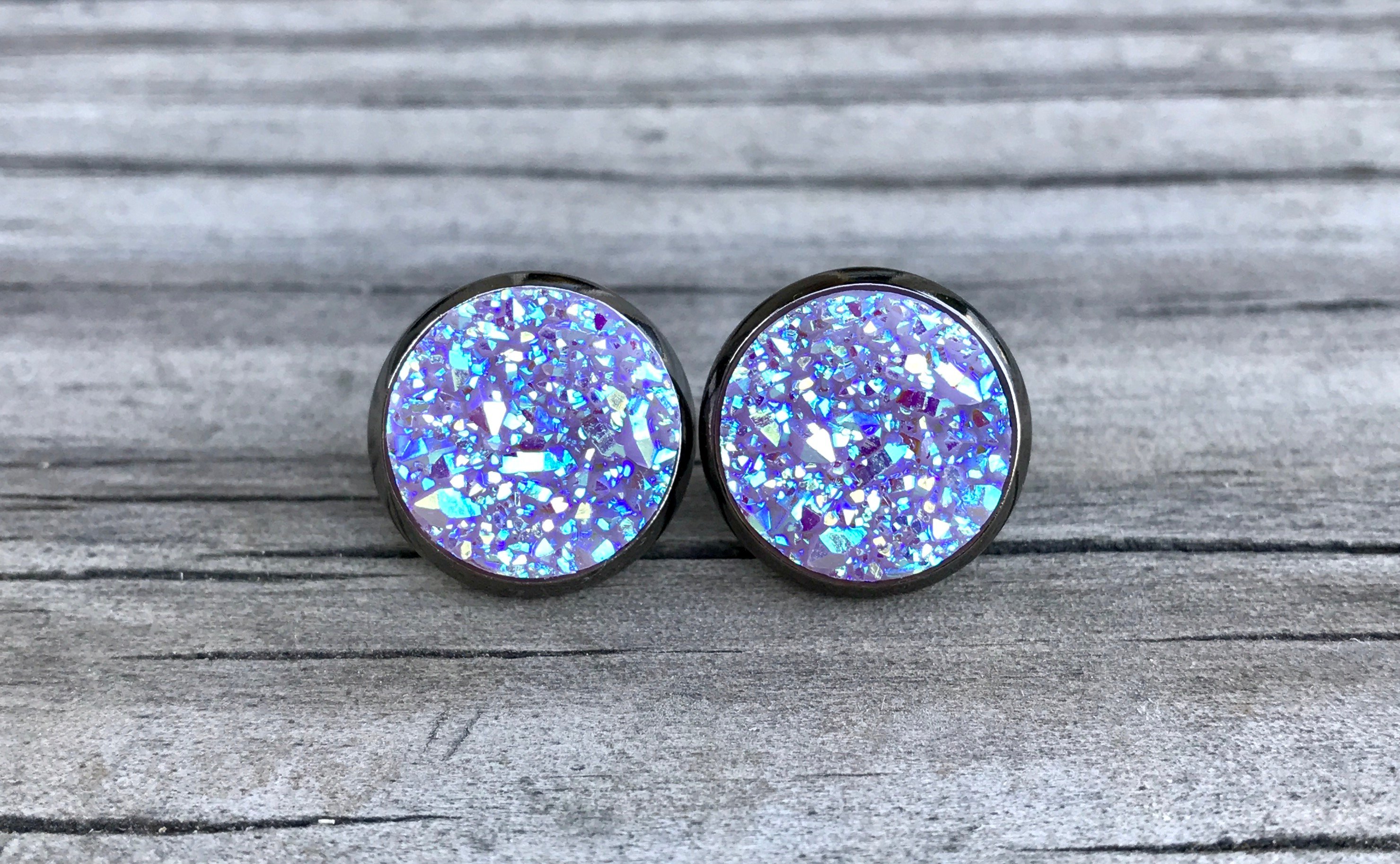 12mm iridescent lilac studs in a gunmetal setting. Guns & lace! These studs are super cute!!!