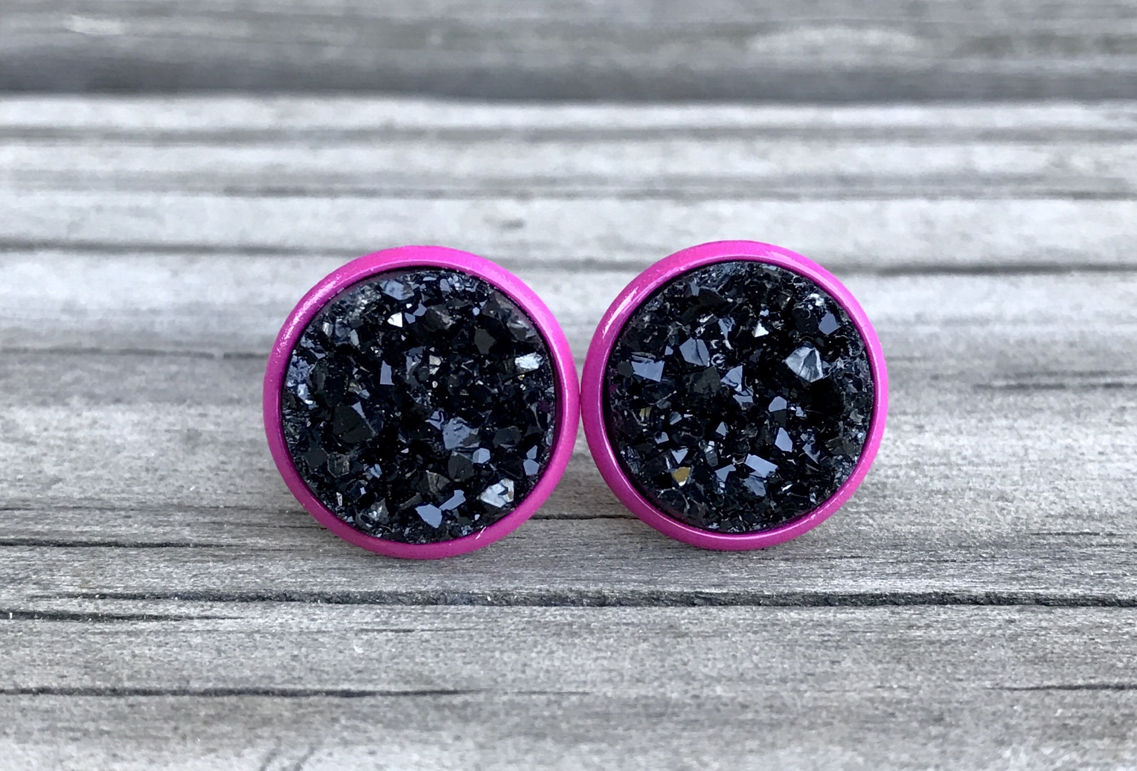 12mm black druzy studs in a hot pink setting.