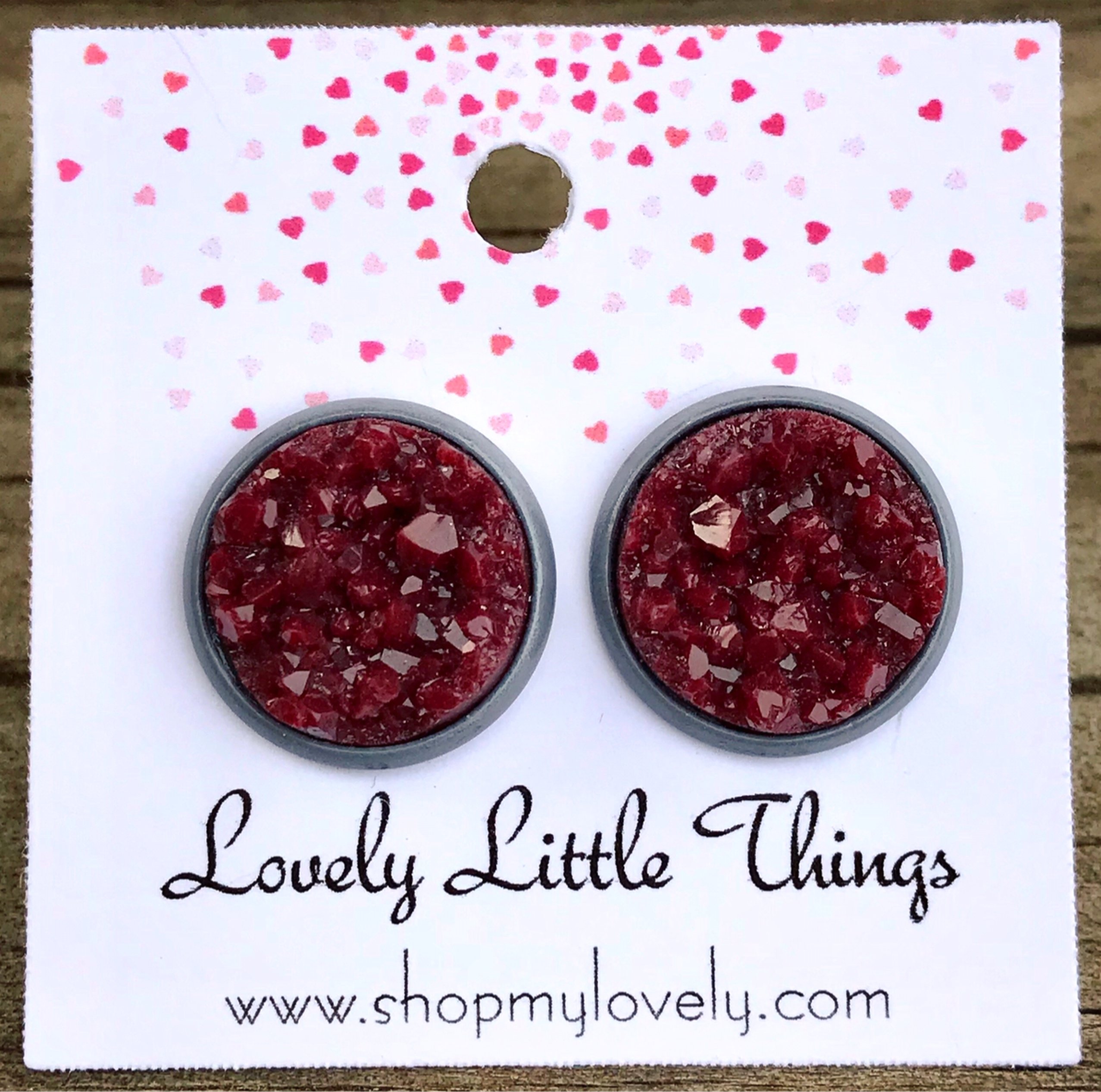 12mm maroon druzy studs in a grey setting. Studs come with clear rubber backs.